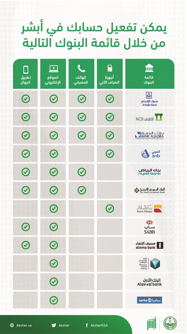 أوضحت منصة أبشر الإلكترونية كيفية تفعيل الحساب على المنصة من خلال عدد من البنوك، مبينة أن التفعيل يتم عبر أكثر من طريقة.