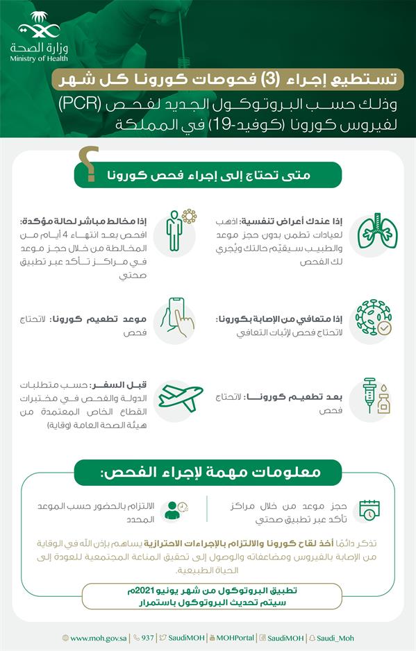 قالت وزارة الصحة إن البروتوكول الجديد لفحص (PCR) لفيروس كورونا في المملكة، يتيح إمكانية إجراء 3 فحوصات لكورونا كل شهر.