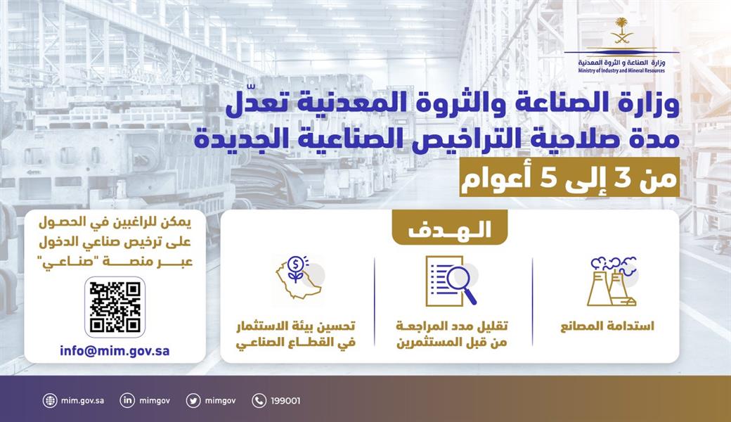 وأبان أن هذا الإجراء يهدف إلى استدامة المصانع وتقليل مُدد المراجعة، إضافةً إلى تسهيل رحلة المستثمر وتحسين الإجراءات المتخذة عند إصدار الترخيص الصناعي وتسريعها، مشيراً إلى أنّ هذه الخطوة ستسهم في تحفيز الاستثمارات الجديدة وجذب الاستثمارات النوعية في مختلف الأنشطة الصناعية وخاصة التي تتطلب مُدداً زمنية متوسطة إلى طويلة.