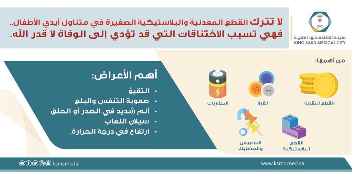 وشددت على أهمية عدم ترك القطع المعدنية أو البلاستيكية أو الأزرار أو البطاريات أو الدبابيس في متناول يد الطفل، مبينة أن ابتلاعها قد يؤدي للاختناق ثم الوفاة لا قدر الله.