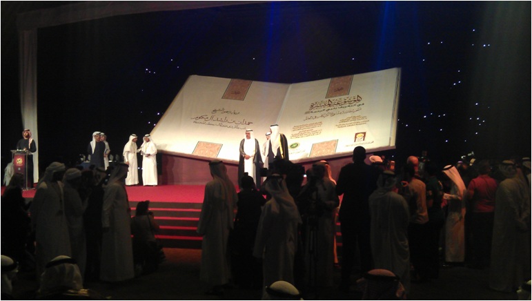ففي حفل كبير أقيم في مركز دبي العالمي للمؤتمرات تم الكشف عن الكتاب وهو نموذج كامل يتضمن 420 صفحة ووزنه 1500 كيلوغرام وطول صفحاته 5 أمتار وعرضها 4 أمتار.