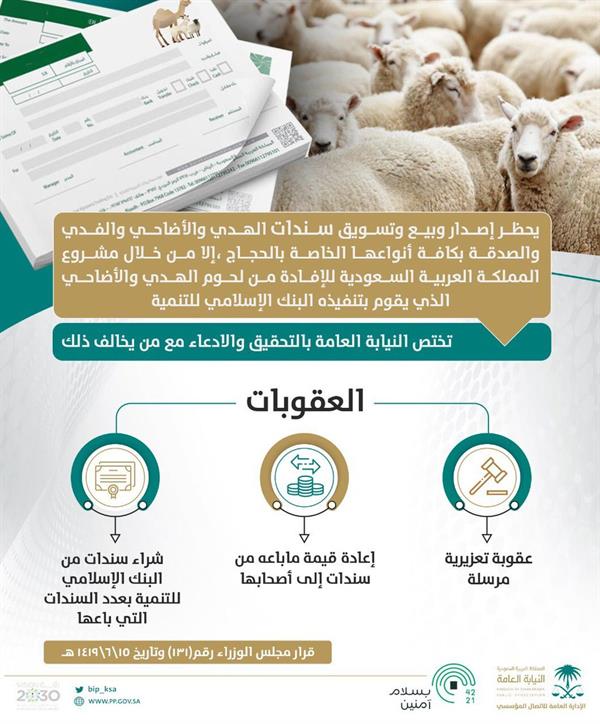 وأكدت النيابة العامة، أنه يحظر إصدار وبيع وتسويق سندات الهدي والأضاحي والفدي والصدقة بكل أنواعها الخاصة بالحجاج إلا من خلال مشروع المملكة العربية السعودية للإفادة من لحوم الهدي والأضاحي الذي يقوم بتنفيذه البنك الإسلامي للتنمية.