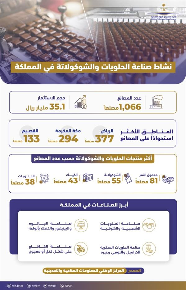 أعلنت وزارة الصناعة والثروة المعدنية، أن حجم الاستثمار في صناعة الحلويات والشوكولاتة في المملكة بلغ 35 مليار ريال، تم ضخها في 1066 مصنعاً، حتى منتصف يوليو الجاري.