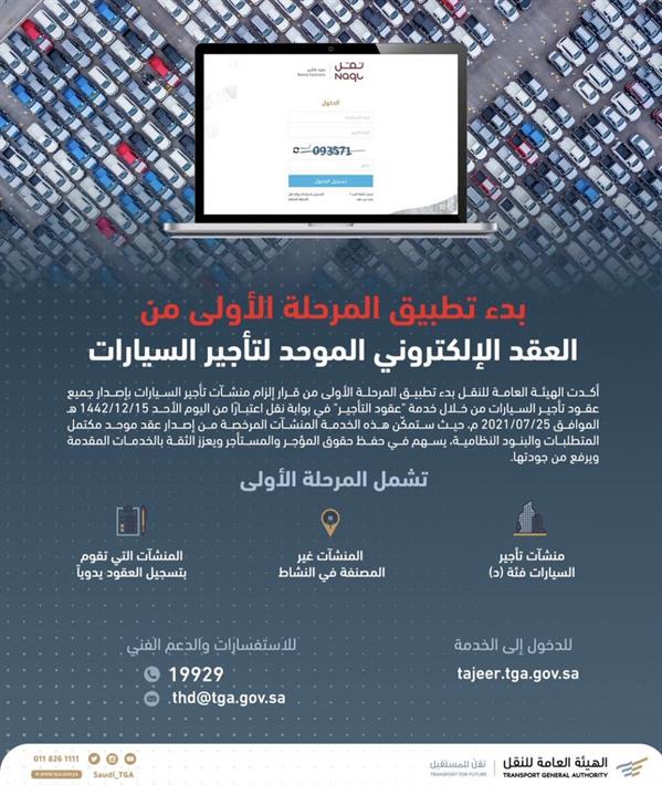 أعلنت الهيئة العامة للنقل بدء تطبيق المرحلة الأولى من قرار إلزام منشآت تأجير السيارات بإصدار جميع عقود تأجير السيارات، من خلال خدمة عقود التأجير في "بوابة نقل" اعتبارًا من اليوم (الأحد).