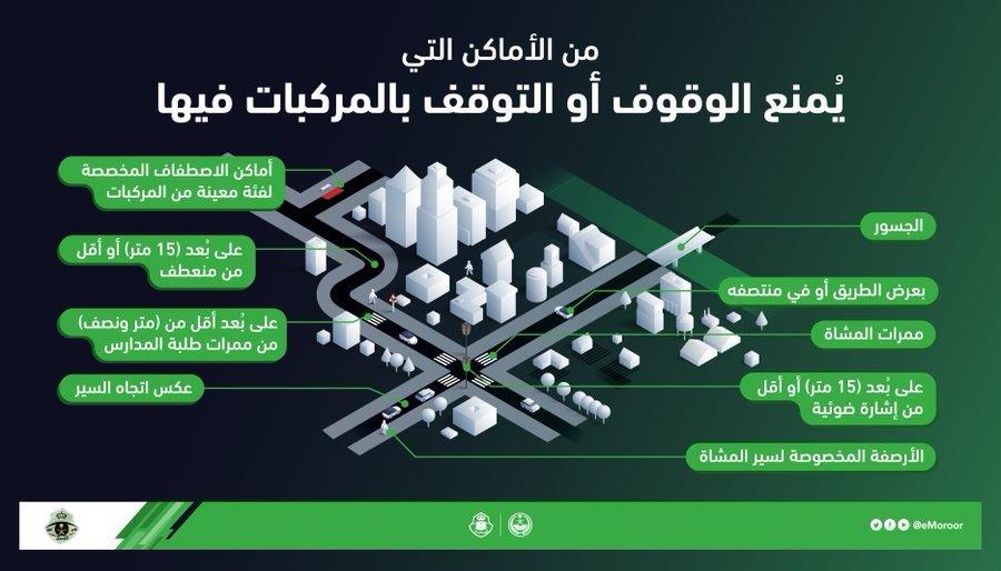 وأضافت الإدارة أن الأماكن تضمنت أيضاً، عدم التوقف بعرض الطريق أو في منتصفه، وممرات المشاة، وعلى بُعد 15 متراً أو أقل من الإشارة الضوئية، والأرصفة المخصوصة لسير المشاة.