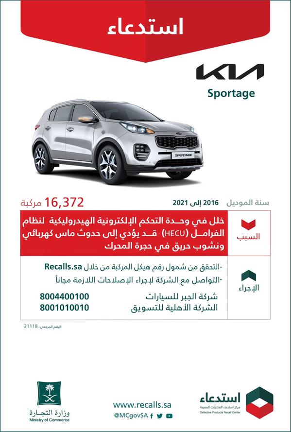 أعلنت وزارة التجارة، اليوم (الأحد)، عن استدعاء 16.3 ألف مركبة من نوع كيا "سبورتاج"، من موديلات 2016 وحتى 2021.