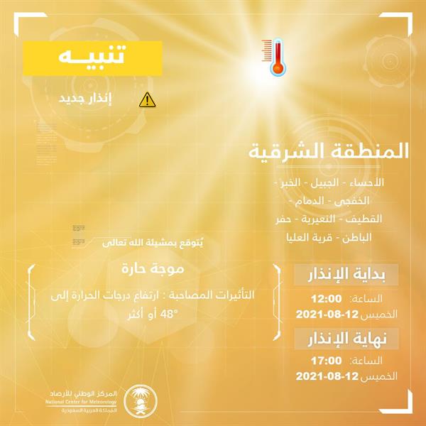 وأشار إلى أن المنطقة الشرقية ستشهد موجة حارة قد تصل درجات الحرارة فيها إلى 48 مئوية، مبيناً أن الحالة تبدأ عند الساعة 12 ظهراً وتستمر حتى الخامسة مساء.