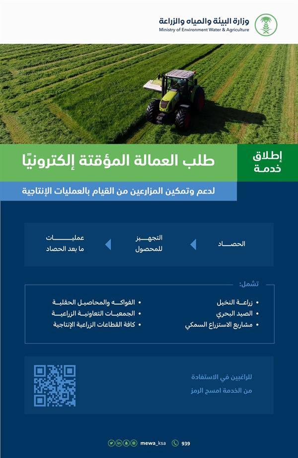 أطلقت وزارة البيئة والمياه والزراعة ممثلةً في بوابة العمالة الزراعية، اليوم (الثلاثاء)، خدمة طلب العمالة المؤقتة إلكترونيًا لدعم وتمكين المزارعين من القيام بالعمليات الإنتاجية.