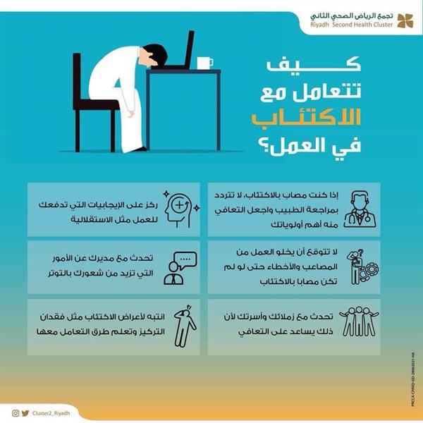 ونصحت الوزارة الأشخاص المصابين بالاكتئاب بضرورة التركيز على الإيجابيات التي تدفعهم للعمل مثل الاستقلالية، والتحدث مع الزملاء والأسرة والمدير عن الأمور التي تزيد من شعورهم بالتوتر؛ لأن ذلك يُساعد على التعافي.