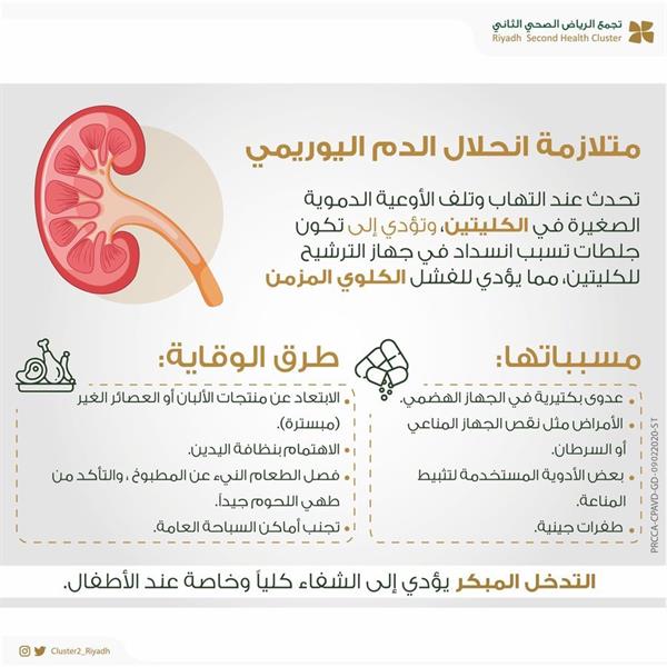 وقالت المدينة إن متلازمة انحلال الدم اليوريمي تحدث عند التهاب وتلف الأوعية الدموية الصغيرة في الكليتين، وتؤدي إلى تكون جلطات تسبب انسداداً في جهاز الترشيح للكليتين؛ مما يؤدي إلى الفشل الكلوي المزمن.
