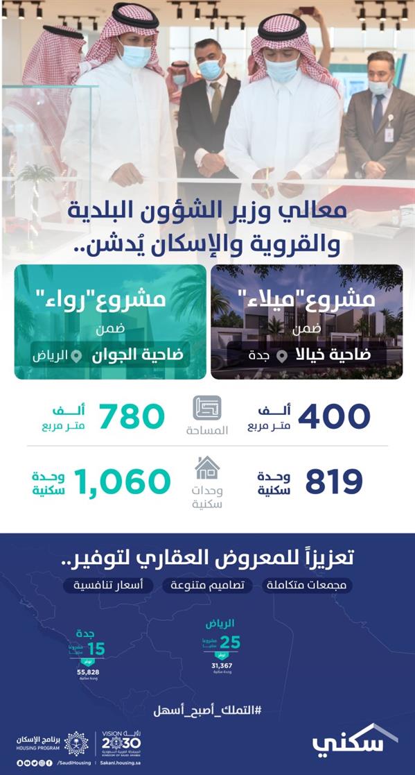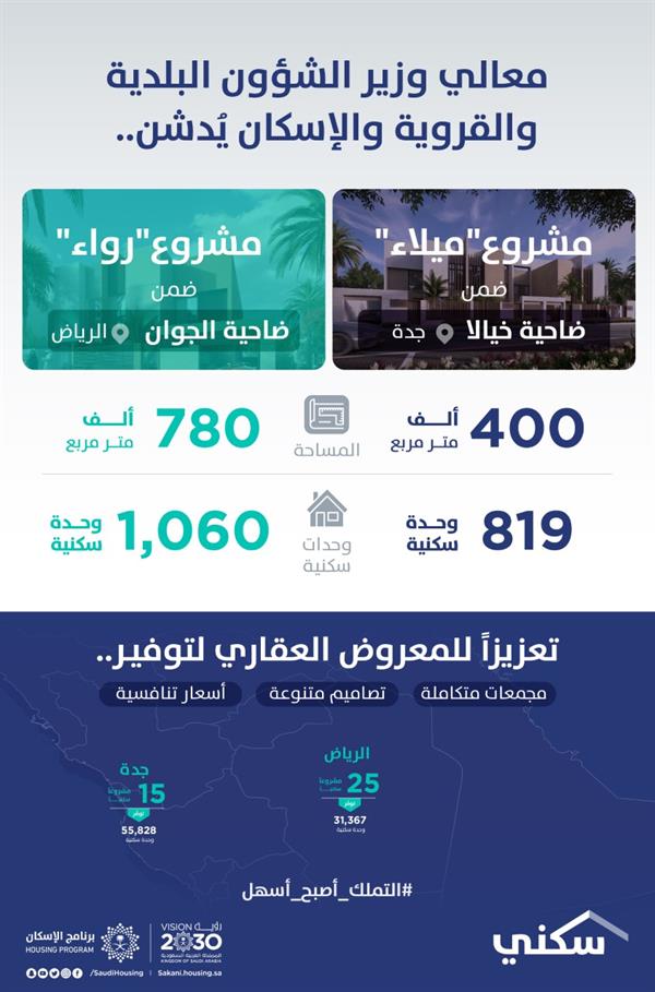 ويوفر مشروع "رواء" السكني الممتد على مساحة تتجاوز 780 ألف م2 نحو 1060 وحدة تحت الإنشاء ضمن أعمال المرحلة الثانية لمشروع مرسية الواقع بالضاحية شمال مدينة الرياض، فيما يضم مشروع "ميلاء" 819 فيلا تحت الإنشاء تقع على مساحة أكثر من 400 ألف م2 ضمن ضاحية خيالا شمال محافظة جدة، وتنفذهما "الوطنية للإسكان" كمطور رئيس، وسيتاح الحجز في مشروع "رواء" السكني في مركز مرسية التفاعلي الواقع في ضاحية الجّوان السكنية الكبرى، بينما سيكون الحجز في مشروع "ميلاء" بمركز سكني الشامل بجدة، وذلك للاطلاع على تفاصيل المشروع والاستفادة من الخيارات التمويلية التي يقدمها "سكني" للمستفيدين.