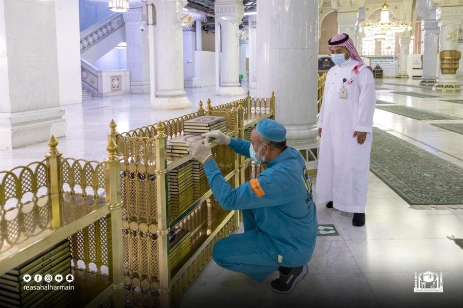 ولفت إلى أنه جرى توزيع المصاحف في التوسعة السعودية الثانية بأدوارها وجزء من المطاف، موضحاً أن الخزانات تخضع لعملية تعقيم مُستمر تتم وفق آلية مُعدة لذلك.