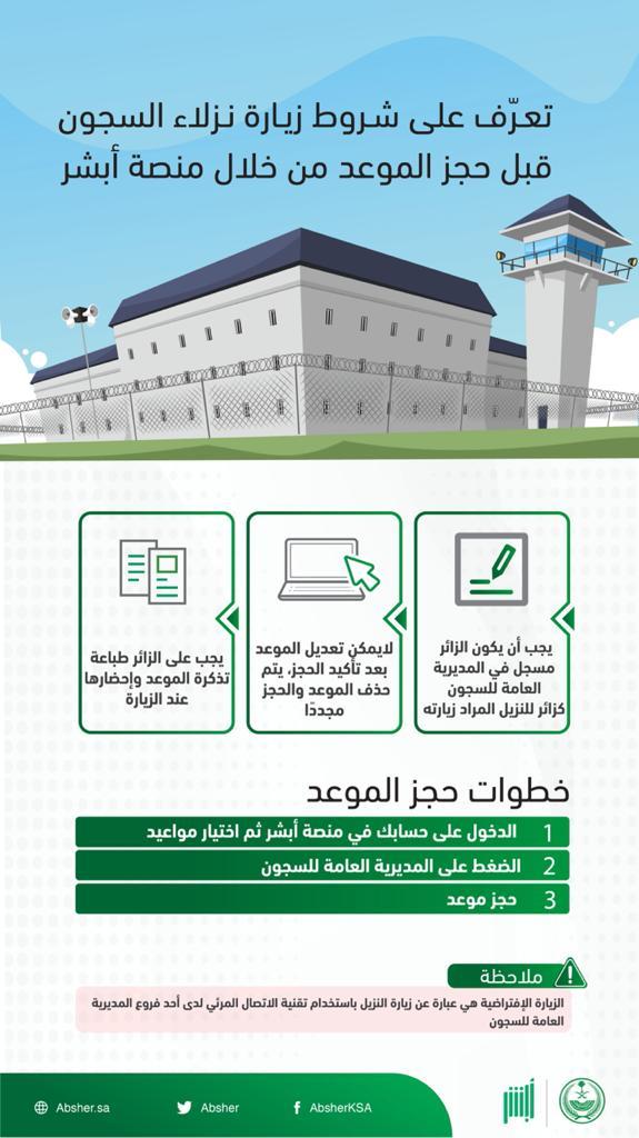 أوضح تطبيق "أبشر"، اليوم الأحد، كيفية الاستفادة من خدمة حجز موعد زيارة نزلاء السجون عبر المنصة.