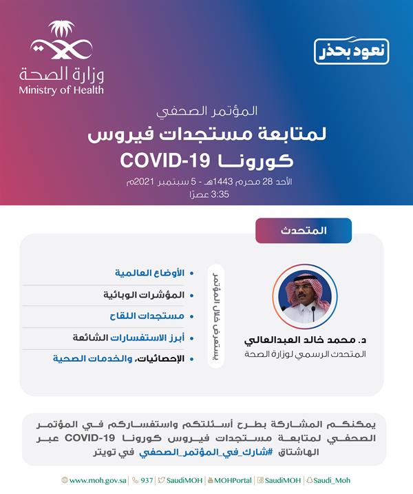 وسيتناول الأوضاع العالمية لكورونا ومستجدات اللقاح، والإحصائيات والخدمات الصحية، إضافة إلى الرد على الاستفسارات الشائعة الواردة في وسم #شارك_في_المؤتمر_الصحفي.