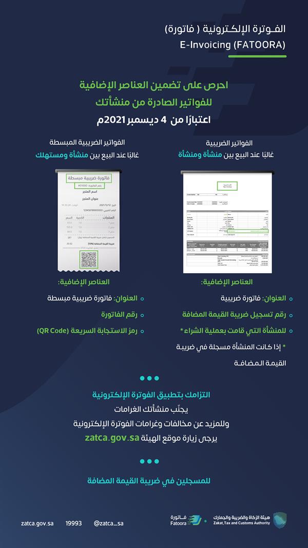 كشفت هيئة الزكاة والضريبة والجمارك، اليوم (الأربعاء)، عن إضافة عناصر يتوجب تضمينها في الفواتير الإلكترونية الصادرة من المنشآت، وذلك اعتباراً من 4 ديسمبر 2021م.