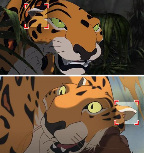 طرزان.. في فيلم طرزان، نجد "سابور" النمر، بإيماءاته الشرسة، طوال الفيلم، وبلون أذن معهود، هو اللون الأسود، في إحدى اللقطات على الشاشة يظهر سابور، بنفس الإيماءات، إلا أننا نلاحظ تغيرًا في لون أذنه من الأسود إلى البرتقالي.