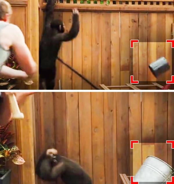 بزوغ كوكب القردة.. في بزوغ كوكب القردة يهرب "سيزر" للعب، ثم يتعرض للهجوم، يطرق سيزر الطاولة وعليها الجالون، لكن بعد طرقة أخرى على الطاولة، يعود الجالون كما كان!