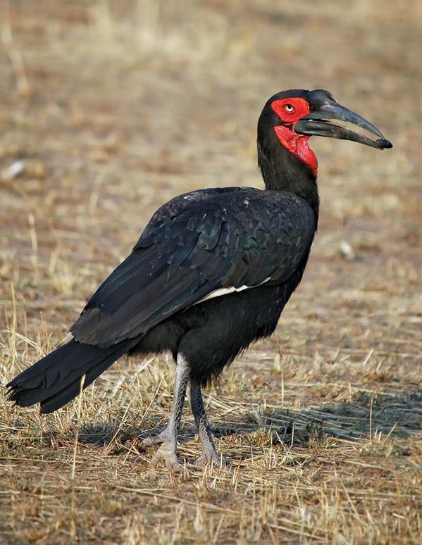 9- طائر "القرن الأرضي الجنوبي": أحد أنواع طيور قرن الزعرور الأرضية، ويستوطن المناطق الجنوبية في القارة الأفريقية، ويُعتبر الأكبر حجماً في فصيلته ويتميّز بلونه الأسود وأرجله الرمادية ووجهه الأحمر ومنقاره الأسود.