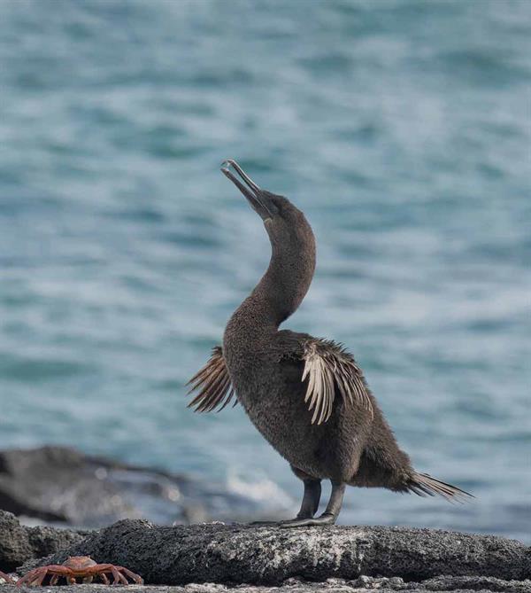 5- طائر "غاقة غالاباغوس": أحد الطيور التي تنتمي إلى فصيلة الغاقيات العاجزة عن الطيران، ويستوطن جزيرتي فرناندينا وإيزابلا في أرخبيل غالاباغوس في الإكوادور، ويبلغ طوله 89 سم، ويتميّز بجناحيه القصيرين.