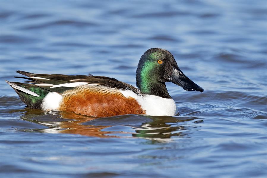 6- طائر "أبو مجرفة الشمالي": ويتميّز بمنقاره الذي يشبه المجراف، ويمتلك رأسا أخضر اللون وصدرا أبيض وبطنا بني اللون، ويفضّل المعيشة في المناطق المائية الغنية بالنباتات.
