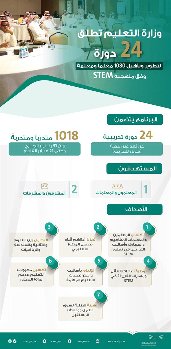 أطلقت وزارة التعليم 24 دورة تدريبية لتطوير قدرات 1018 من المعلمين والمعلمات على المشاريع والتجارب وفق منهجية STEM.