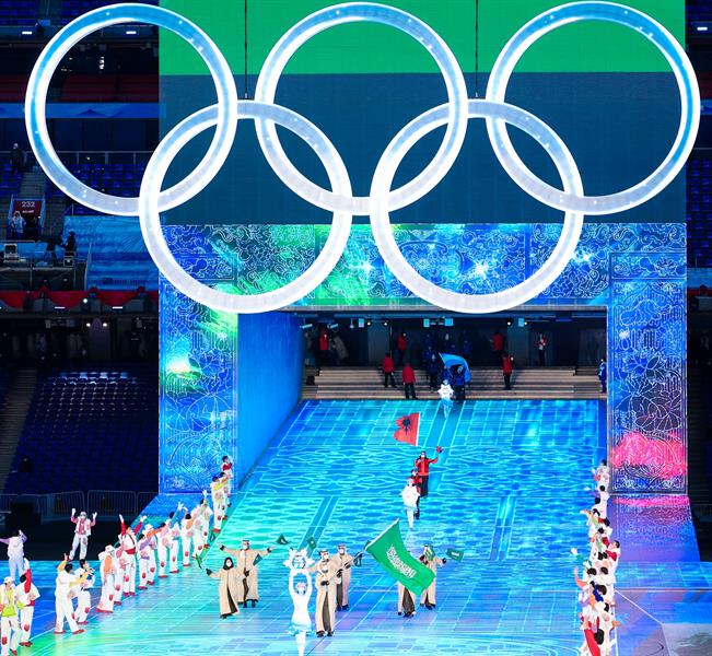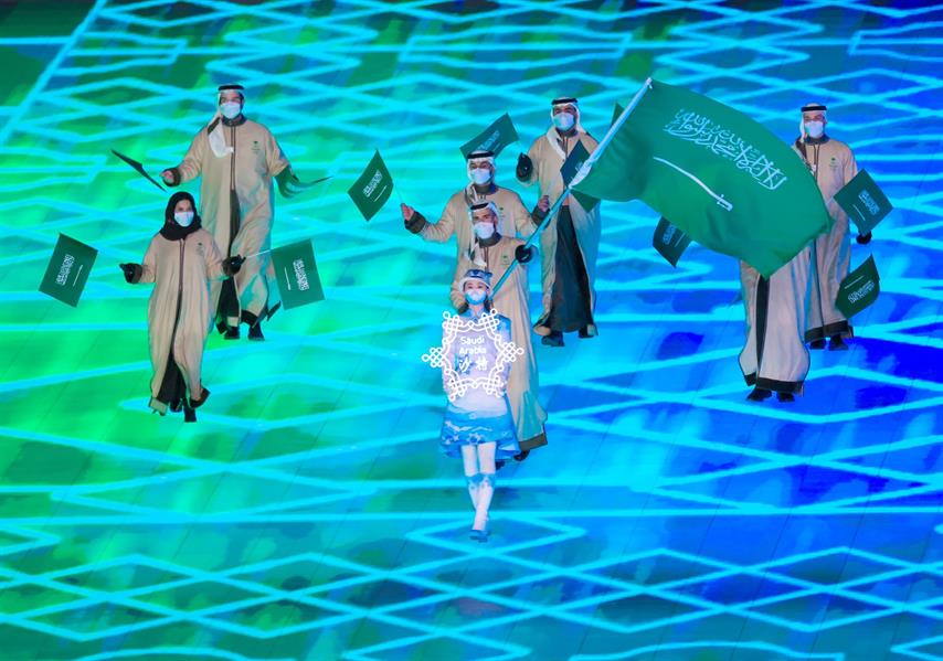 رفع أول لاعب سعودي يُشارك في دورات الألعاب الأولمبية الشتوية، فائق عابدي، اليوم (الجمعة) علم المملكة متقدمًا أفراد البعثة السعودية خلال مراسم حفل افتتاح دورة الألعاب الأولمبية الشتوية بكين 2022.