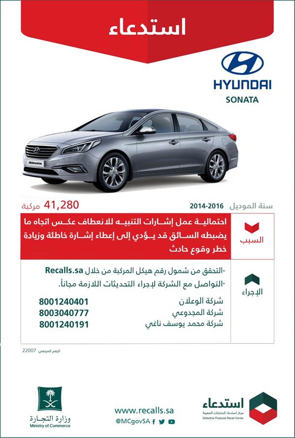 أعلنت وزارة التجارة، اليوم (الأحد)، استدعاء أكثر من 41 ألف مركبة هيونداي"SONATA"، موديلات 2014- 2016.