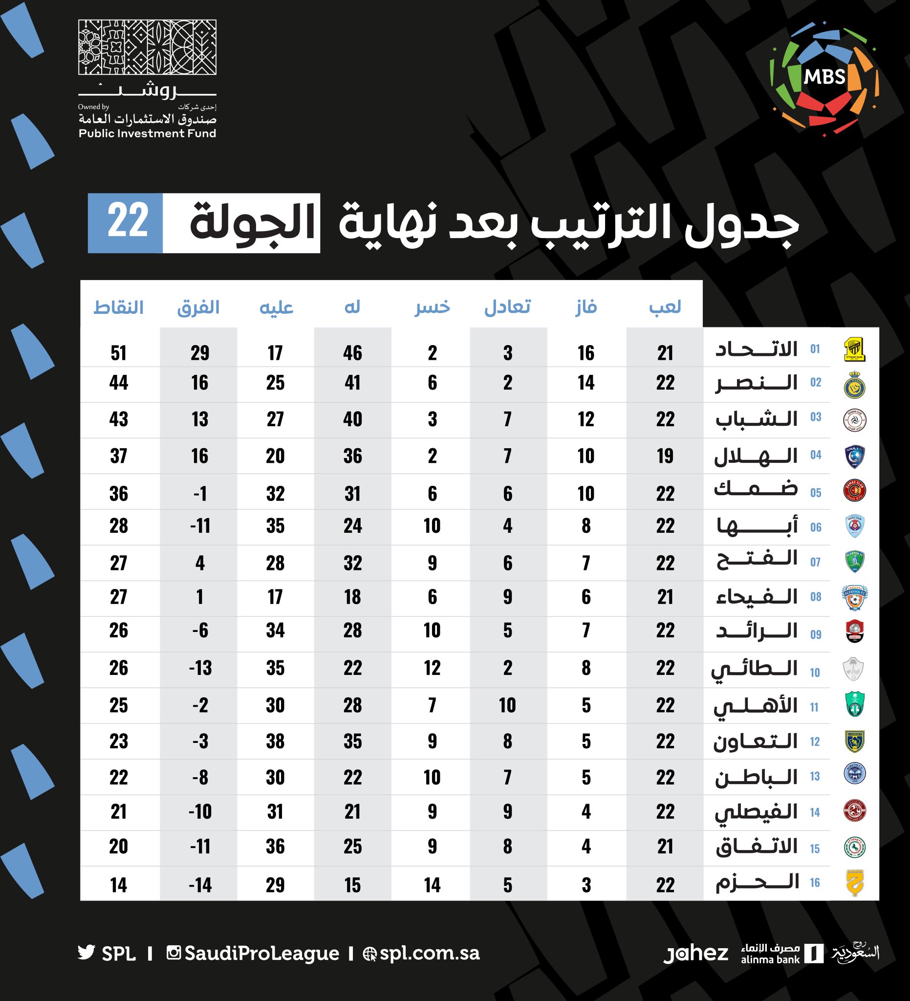 وبعد انتهاء الجولة الـ22 من دوري المحترفين حافظ فريق الاتحاد على صدارة جدول ترتيب أندية المسابقة برصيد 51 نقطة، ويليه نادي النصر ثانيًا برصيد 44 نقطة، فيما جاء الشباب في المركز الثالث بـ43 نقطة، وجاء الهلال رابعًا برصيد 37 نقطة، وضمك خامسًا برصيد 36 نقطة.