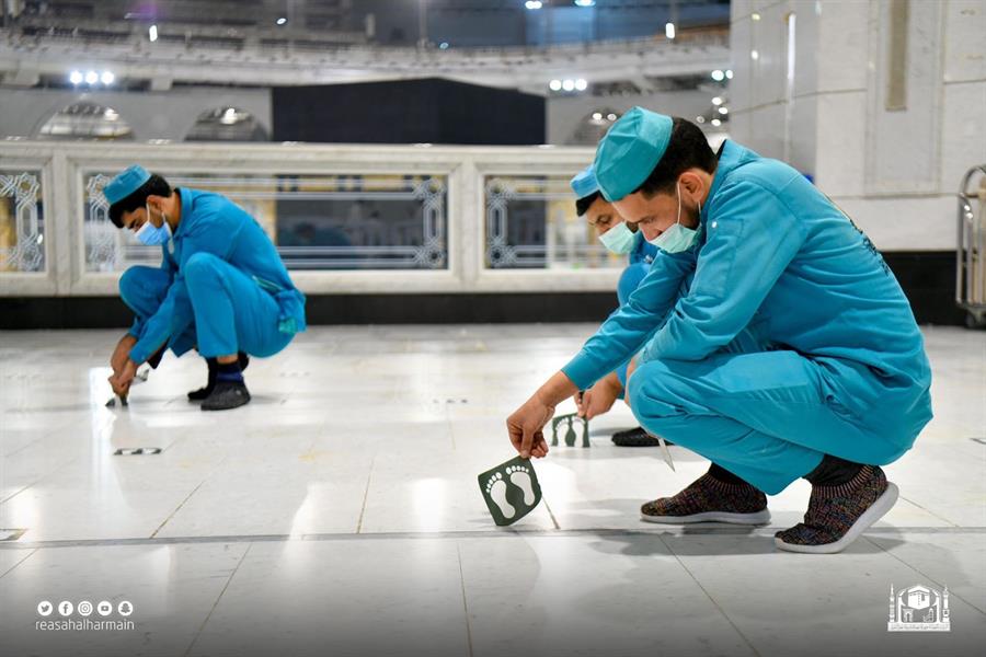 في سياق متصل، بدأ موظفو رئاسة شؤون الحرمين بإزالة ملصقات التباعد الاجتماعي من جميع أجزاء المسجد الحرام، استعداداً لصلاة فجر اليوم.
