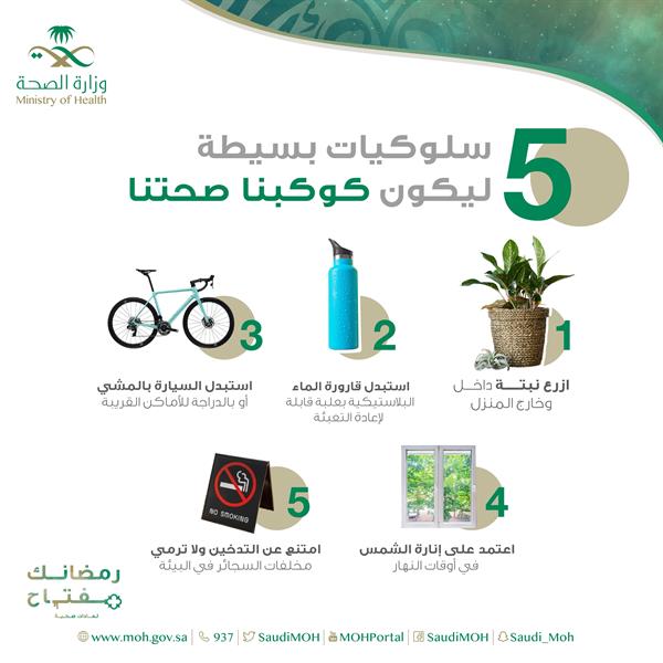 أوصت وزارة الصحة الجميع باتباع خمسة سلوكيات بسيطة لها أثر إيجابي على الكوكب بشكل عام، وذلك ضمن يوم الصحة العالمي.
