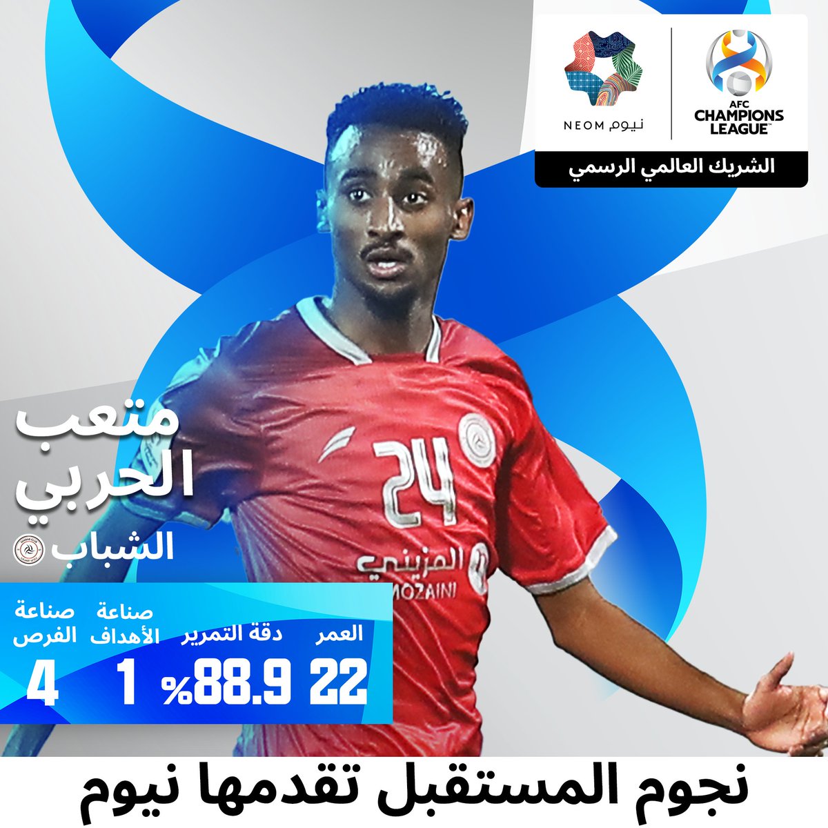 اختار الاتحاد الآسيوي لكرة القدم، اليوم الجمعة، لاعب فريق الشباب، متعب الحربي، كأبرز النجوم الواعدين في الجولة السادسة والأخيرة بدور المجموعات بدوري الأبطال 2022.