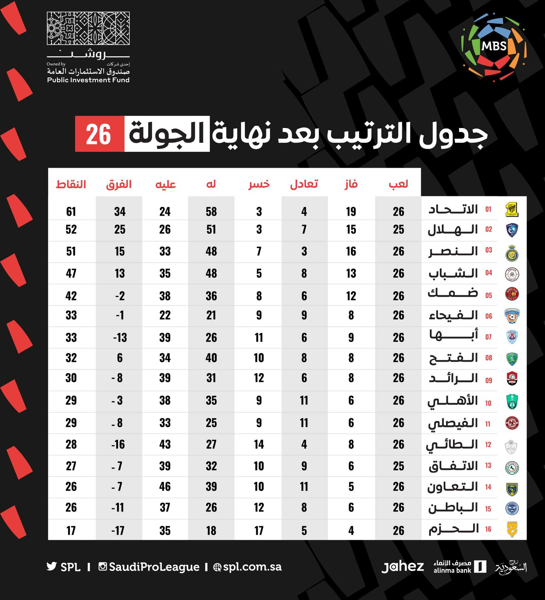 وبعد انتهاء الجولة الـ26 بدوري المحترفين، واصل فريق الاتحاد احتلاله صدارة جدول ترتيب أندية المسابقة برصيد 61 نقطة، ويليه نادي الهلال ثانيًا برصيد 52 نقطة، ويليه النصر في المركز الثالث بـ51 نقطة، وجاء الشباب رابعًا برصيد 47 نقطة، وضمك خامسًا برصيد 42 نقطة.