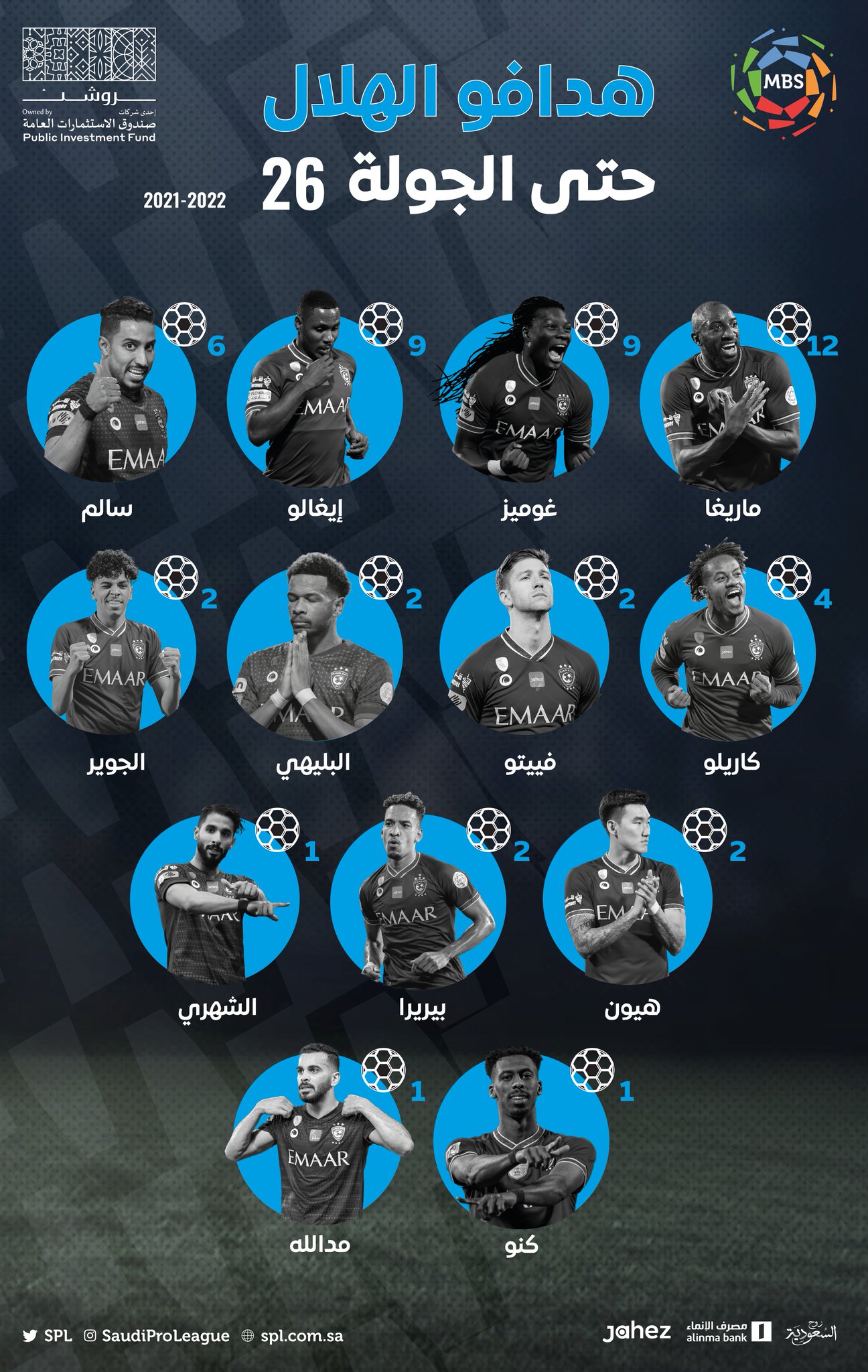 ونستعرض هدافي الهلال حتى الجولة الـ26 بدوري المحترفين كالتالي: