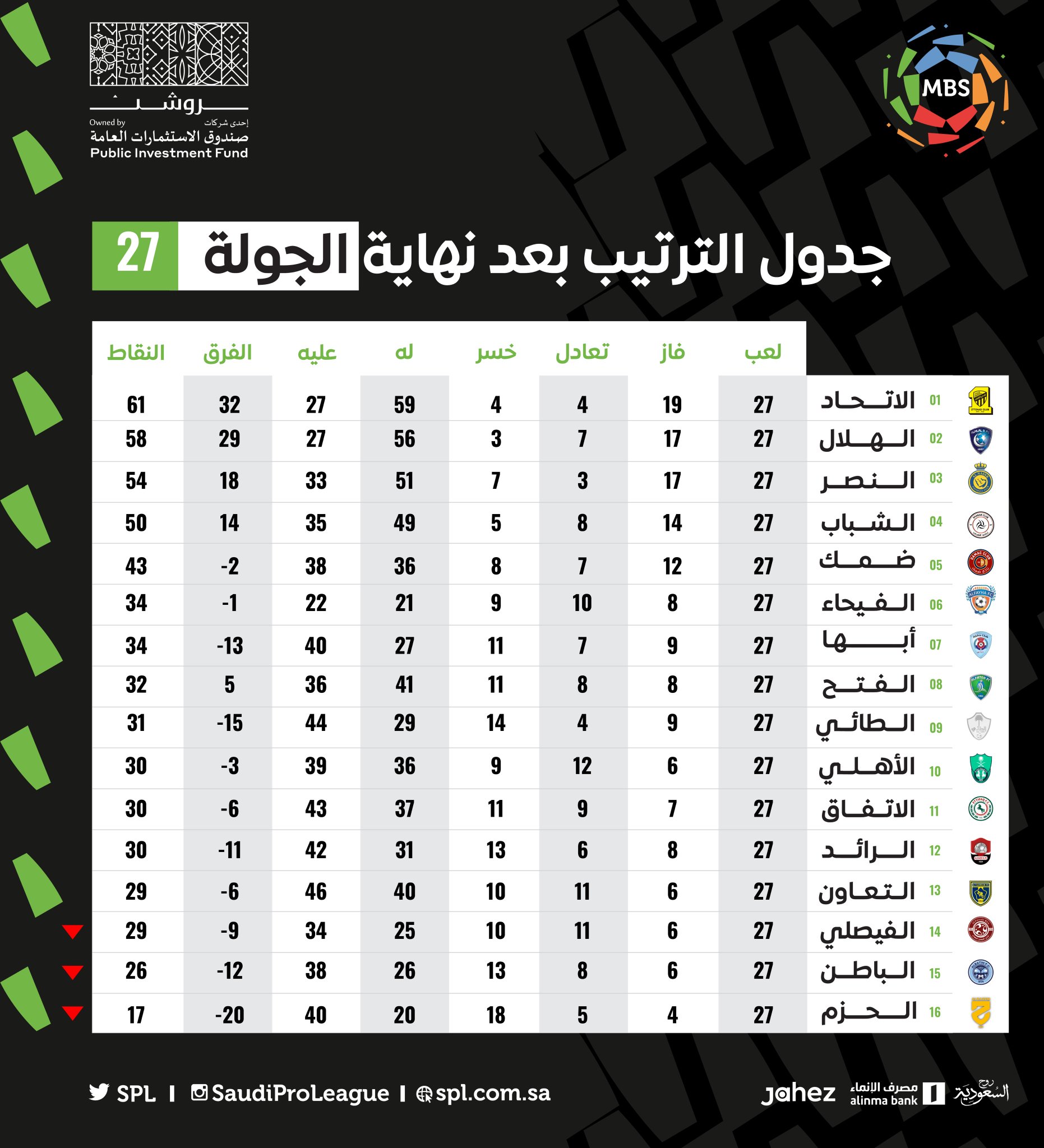 وبعد انتهاء مباريات الإثنين، واصل فريق الاتحاد احتلاله صدارة جدول ترتيب أندية المسابقة برصيد 61 نقطة، ويليه نادي الهلال ثانيًا برصيد 58 نقطة، ويليه النصر في المركز الثالث بـ54 نقطة، وجاء الشباب رابعًا برصيد 50 نقطة، وضمك خامسًا برصيد 43 نقطة.