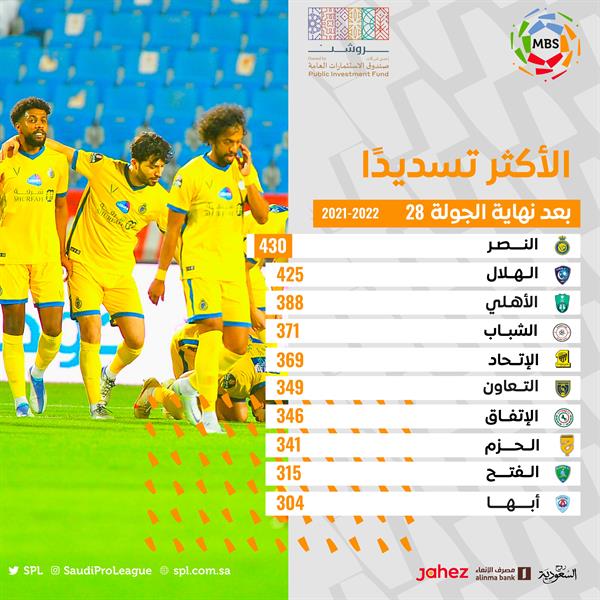 ويتصدر النصر القائمة، التي نشرها حساب دوري كأس الأمير محمد بن سلمان، اليوم (الثلاثاء)، بـ 430 تسديدة يليه الهلال بـ 425 تسديدة ثم الأهلي بـ 388 تسديدة.