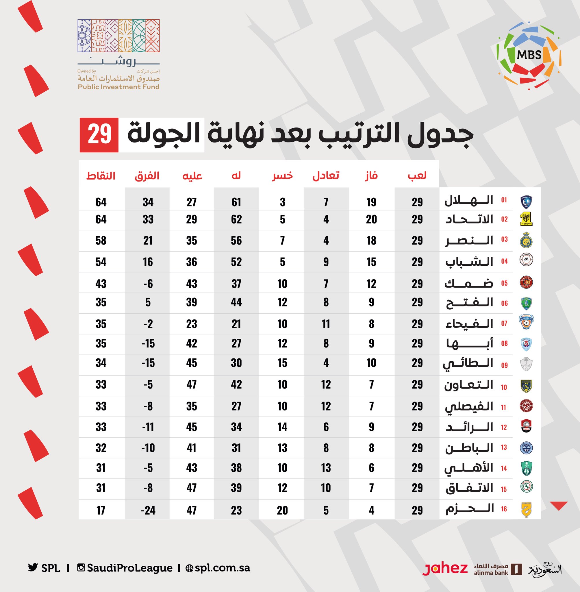 اختتمت مساء الخميس، منافسات الجولة الـ29 بدوري كأس الأمير محمد بن سلمان للمحترفين، بفوز فريق الهلال على نظيره الفتح بثلاثية نظيفة، وفوز الاتحاد على نظيره الاتفاق بثلاثية مقابل هدف.