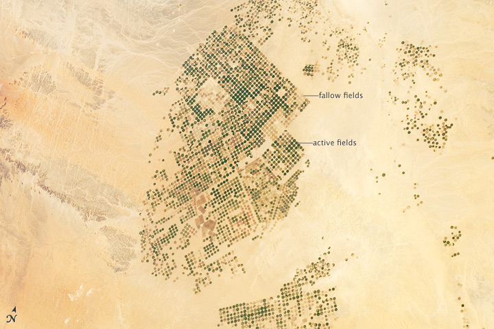 وتظهر إحدى الصور التي التقطت في 21 فبراير 2012 مساحات الأراضي التي تغطيها الخضرة، وقالت "ناسا" إن هناك حقولا تظهر بلون أخضر داكن وتمثل الأراضي المزروعة حاليا والتي تبلغ مساحة الدائرة الواحدة منها حوالي كلم مربع، أما الدوائر التي تميل للون الأصفر والبني فهي تمثل دوائر كانت مزروعة سابقا.