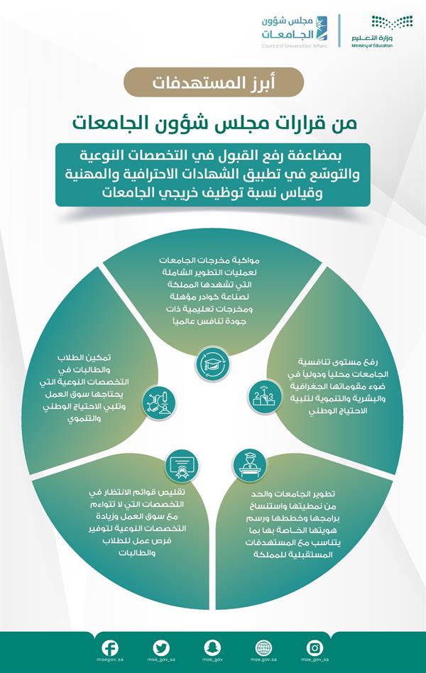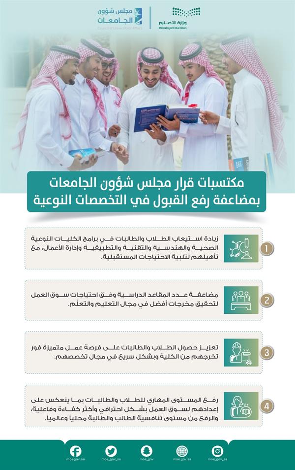 وتضمَّنت قرارات مجلس شؤون الجامعات، رفع القبول إلى ضِعْفِ ما كان عليه عام 2020م في الكليات النوعية (الصحية والهندسية والتقنية والتطبيقية وإدارة الأعمال) وفقاً للطاقة الاستيعابية لتلك الكليات، وبما يحسِّن من مخرجات العملية التعليمية، ويسهم في سد احتياجات سوق العمل.