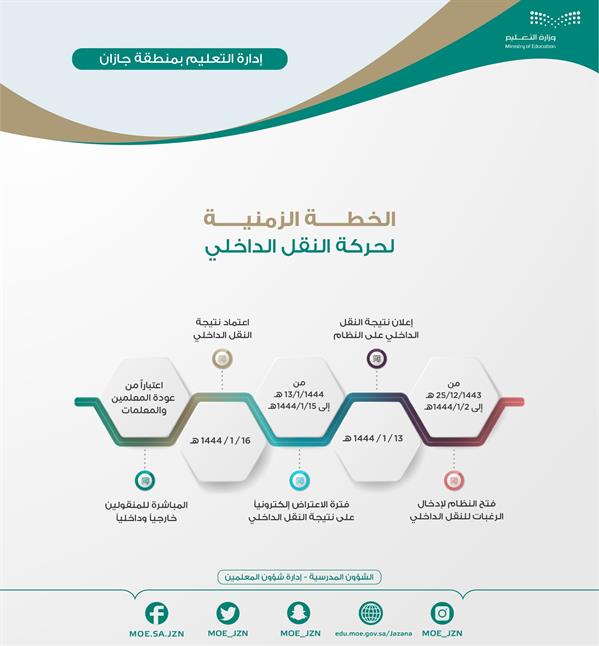 من جهة ثانية، تبدأ الوزارة استقبال طلبات النقل الداخلي للمعلمين والمعلمات، اعبتارًا من غد (الأحد)، عبر نظام "فارس" ولمدة أسبوع. ومن المقرر إعلان نتيجة النقل الداخلي بتاريخ 13- 1- 1444هـ واعتمادها في 16 من الشهر ذاته.