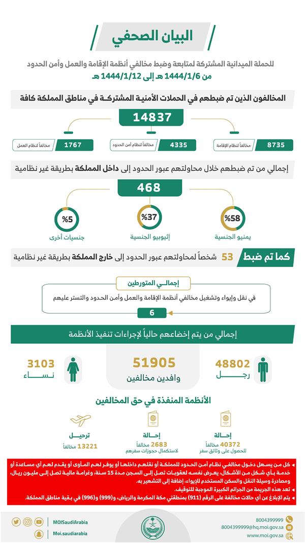 وأوضحت أنه تم ضبط 6 متورطين في نقل وإيواء وتشغيل مخالفي أنظمة الإقامة والعمل وأمن الحدود والتستر عليهم، فيما بلغ إجمالي من يتم إخضاعهم حالياً لإجراءات تنفيذ الأنظمة نحو 53 ألف وافد مخالف، نحو 49 ألف رجل و3.1 ألف امرأة.