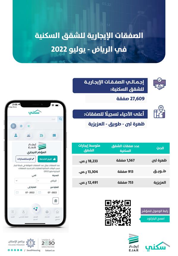 وجاءت الأحياء الثلاثة الأعلى تسجيلا لأعداد صفقات الشقق السكنية، حي ظهرة لبن الذي سجل ارتفاعاً في متوسط القيم الإيجارية بنسبة 4%، بينما سجل حي طويق- ثاني أعلى حي بعدد صفقات الشقق - انخفاضًا في متوسط القيم الإيجارية بنسبة 12%، وسجل حي العزيزية انخفاضا بنسبة 14% وجاء ثالثاً في عدد الصفقات.