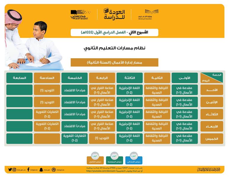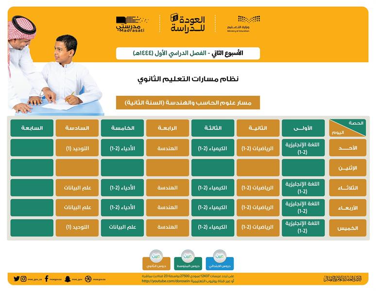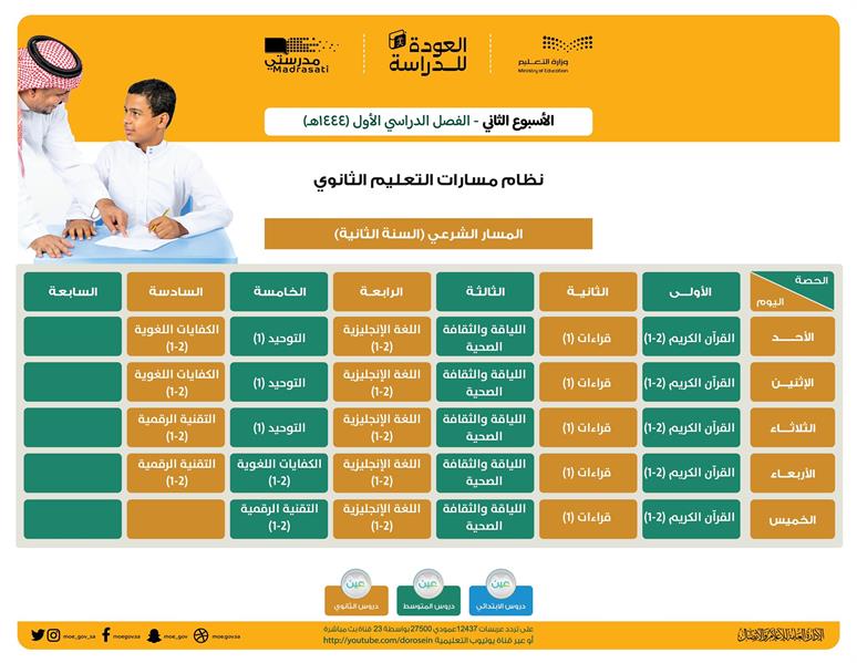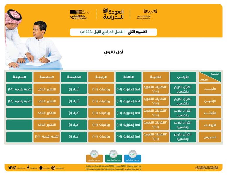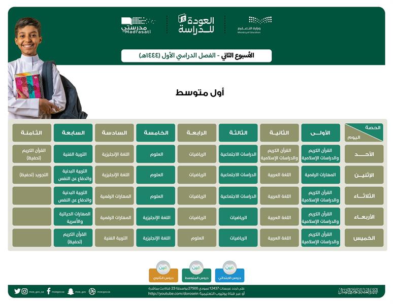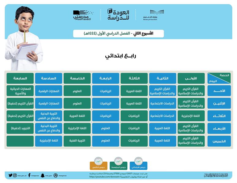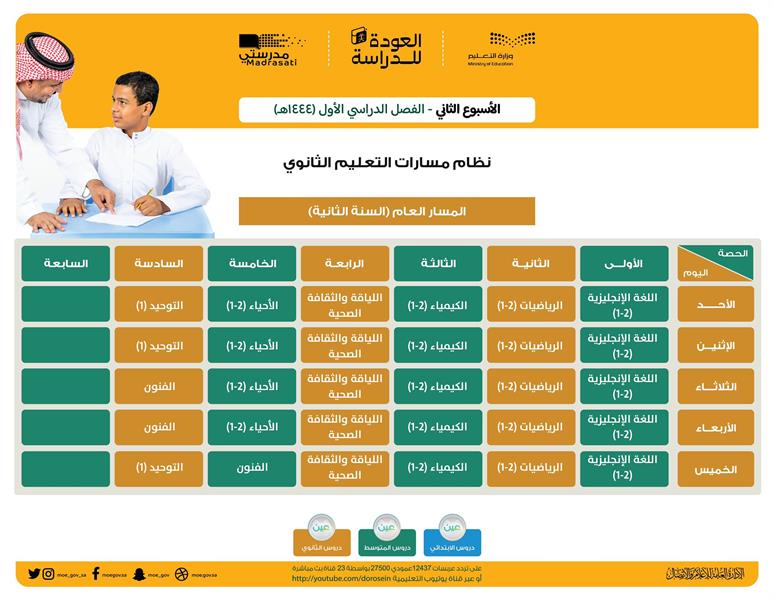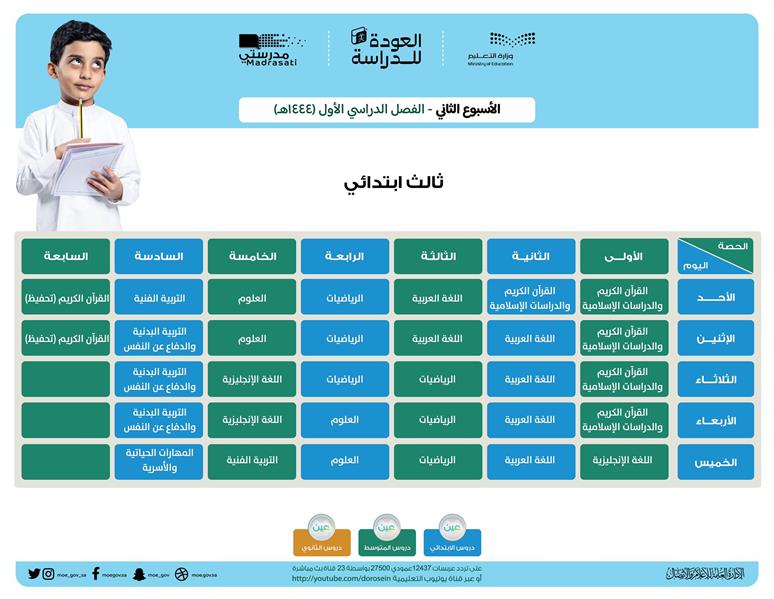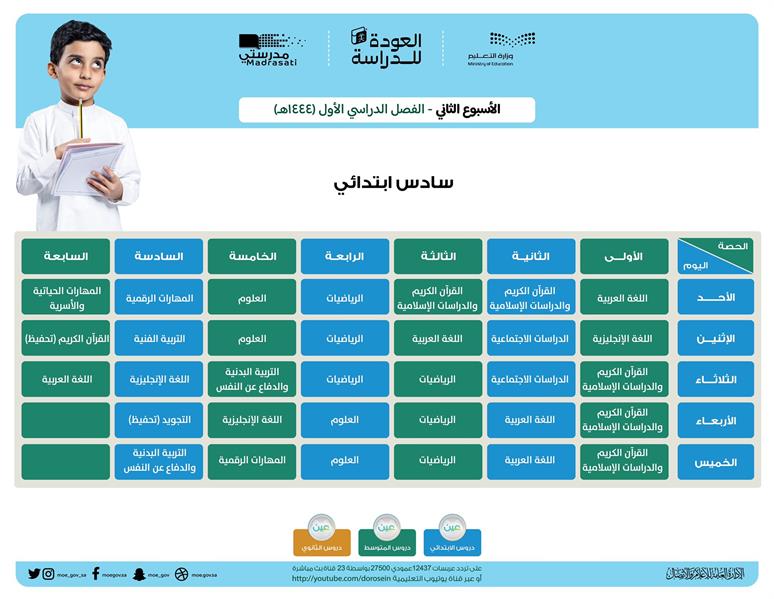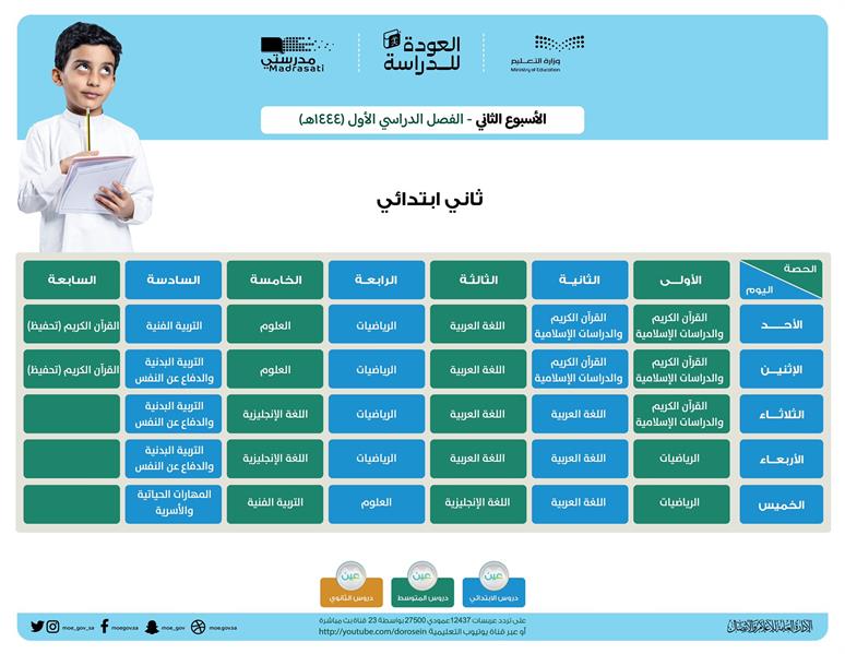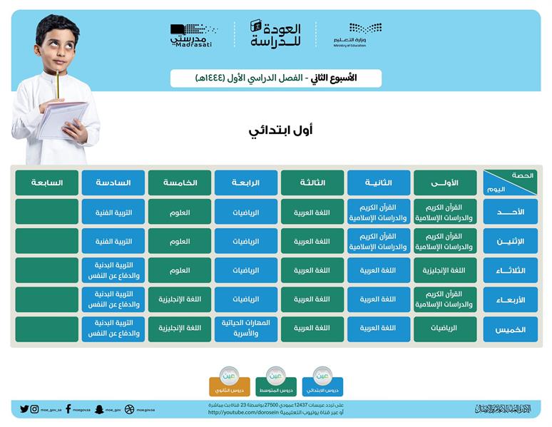 أعلنت وزارة التعليم، اليوم (السبت)، جداول الحصص اليومية لجميع المراحل الدراسية للأسبوع الثاني من الفصل الدراسي الأول؛ وذلك عبر قنوات "عين" أو منصة "مدرستي".