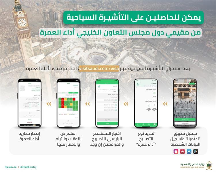 أوضحت وزارة الحج والعمرة أنه يمكن للحاصلين على التأشيرة السياحية من المقيمين في دول مجلس التعاون الخليجي، أداء العمرة.