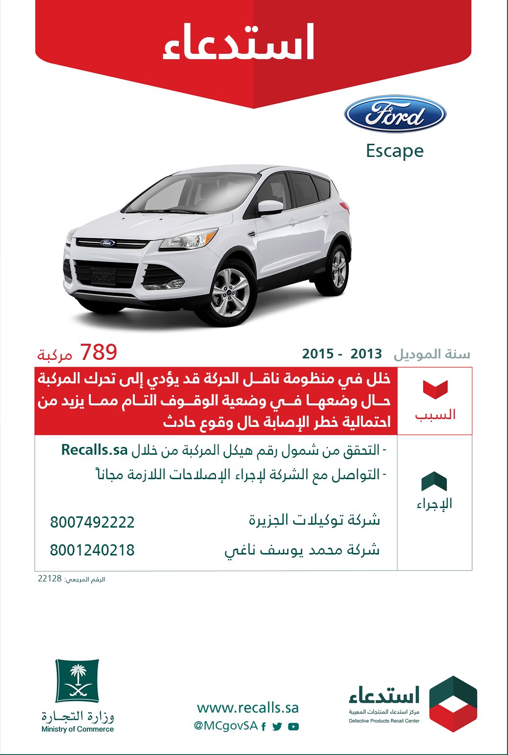 أعلنت وزارة التجارة اليوم (الثلاثاء)، استدعاء 789 مركبة من نوع فورد "Escape"، موديلات (2013-2015).