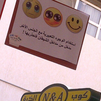 تداول مغردون على موقع التواصل الاجتماعي "تويتر" لافتة عرضت بمدخل إحدى الجامعات تحذر فيها طالباتها من استخدام الوجوه التعبيرية كونها مدخلا من مداخل الشيطان.