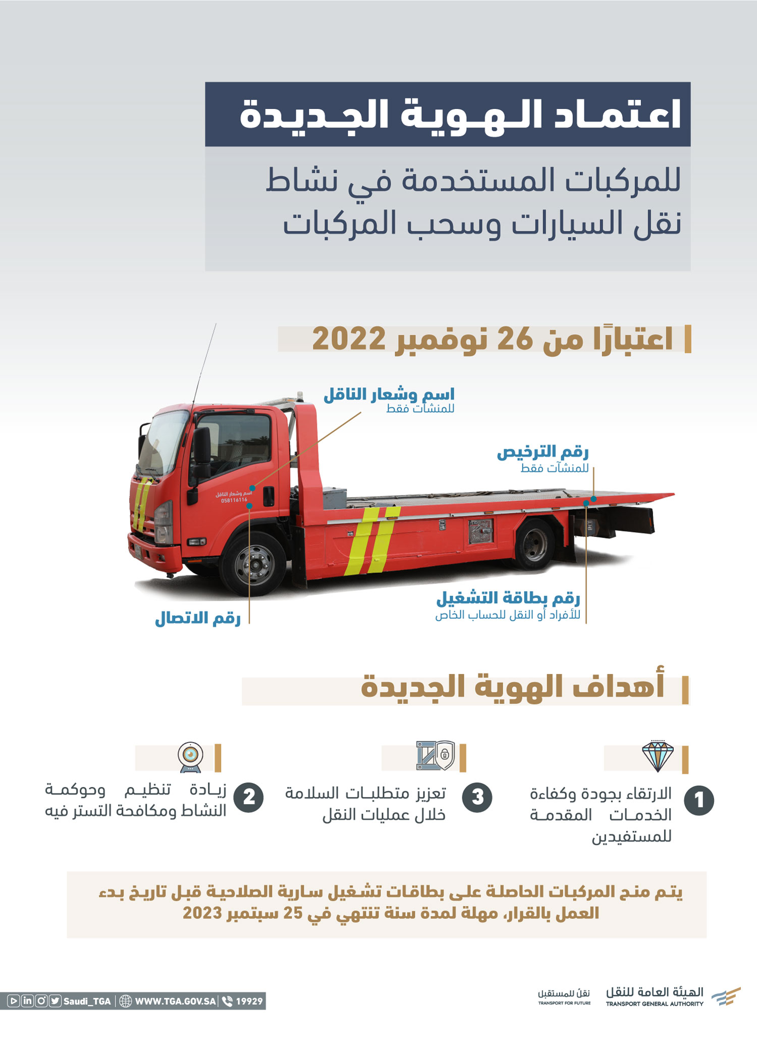 أعلنت الهيئة العامة للنقل، اليوم (الأربعاء)، اعتماد الهوية الجديدة للمركبات المستخدمة في نشاط نقل السيارات وسحب المركبات، التي تتضمن اللون الموحد، والعلامات والبيانات المطلوب وضعها على المركبات التي تعمل في نشاط نقل السيارات وسحب المركبات في المملكة.