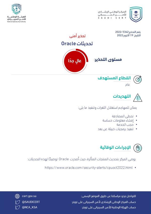 وأكد المركز الوطني الإرشادي للأمن السيبراني أهمية تحديث المنتجات المتأثرة من خلال التوصيات والإرشادات التي أعلنت عنها Oracle.