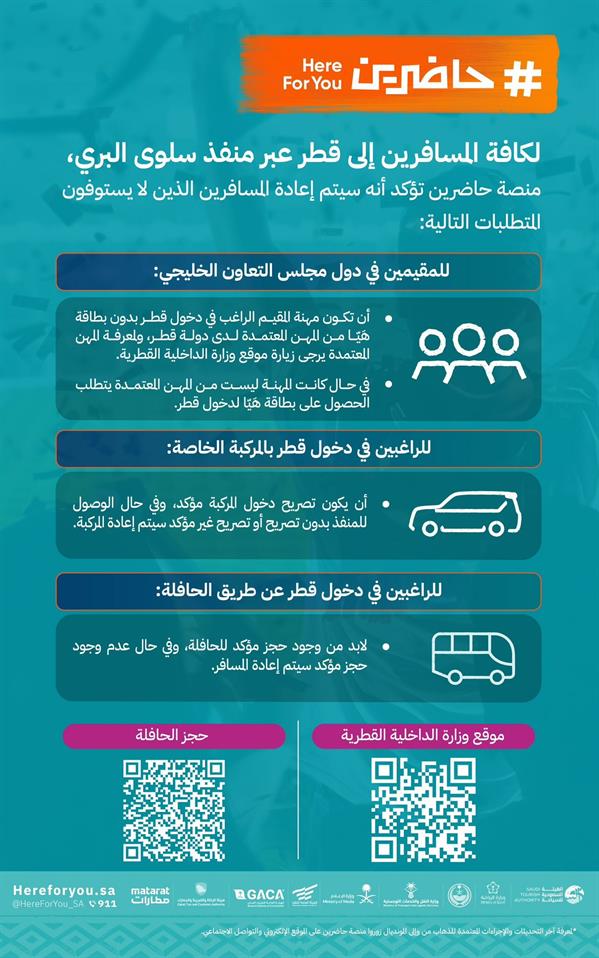 وتابعت أن الراغبين في دخول قطر بالمركبة الخاصة عليهم الحصول على تصريح دخول مؤكد للمركبة، وفي حال الوصول للمنفذ بدون تصريح أو تصريح غير مؤكد سيتم إعادة المركبة.