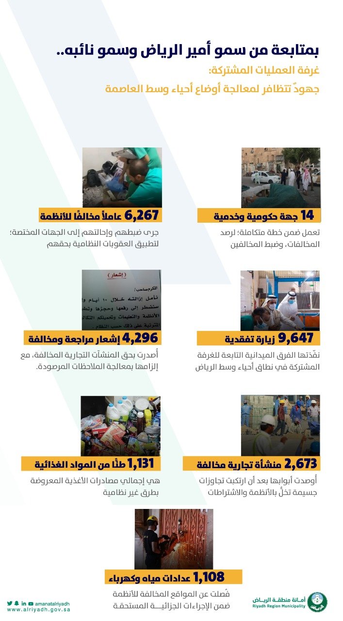 يذكر أن غرفة العمليات المشتركة تضم 14 جهة حكومية تشمل إمارة المنطقة، والأمانة، وشرطة ومرور الرياض، والجوازات؛ والدفاع المدني، بالإضافة إلى فروع وزارات التجارة، والموارد البشرية، والبيئة والمياه، وهيئة الاتصالات، والهيئة العامة للغذاء والدواء، وشركتي الكهرباء والمياه.