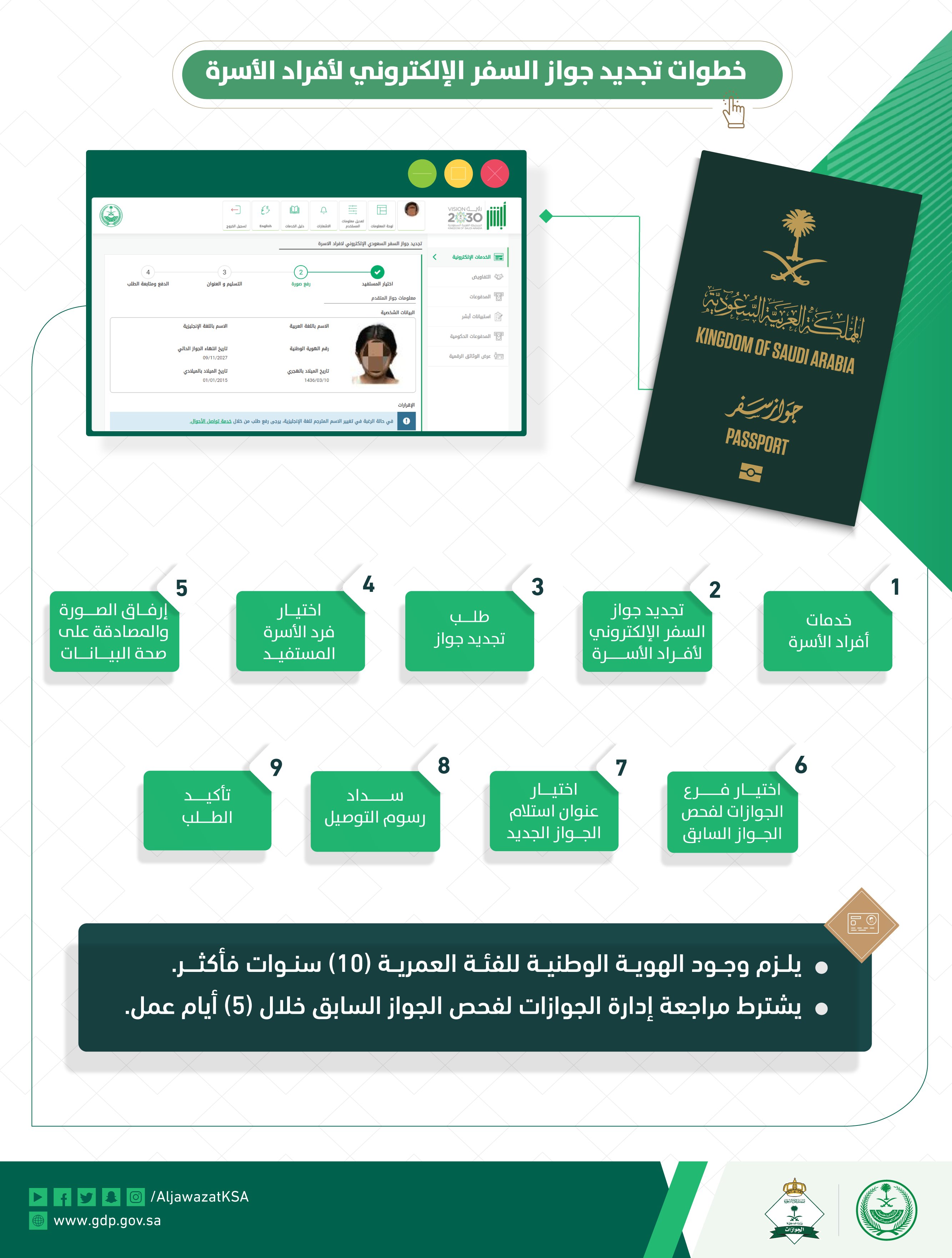 وأشارت إلى أنه يمكن للمواطن تجديد الجواز الإلكتروني للتابعين له من 21 عامًا فأقل عبر حسابه على منصة "أبشر" ومراجعة أقرب فرع للجوازات بالجواز السابق لفحصه، وذلك من دون حجز موعد مسبق، داعية إلى الاستفادة من الخدمات الإلكترونية المقدمة عبر منصة (أبشر).